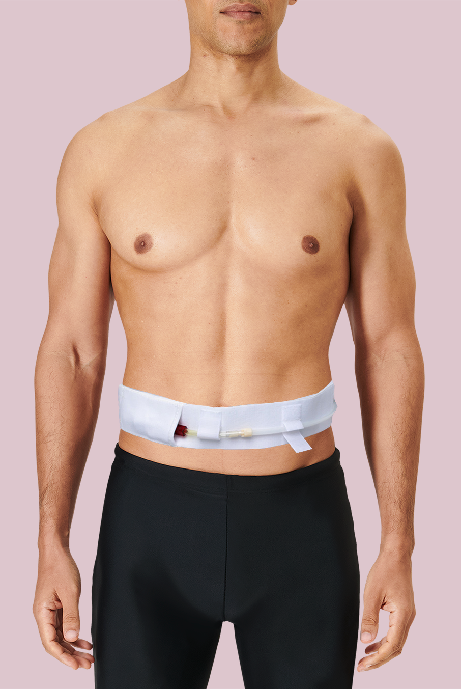 Our PD catheter belt is designed with additional material to allow adjustment of the belt throughout the day.